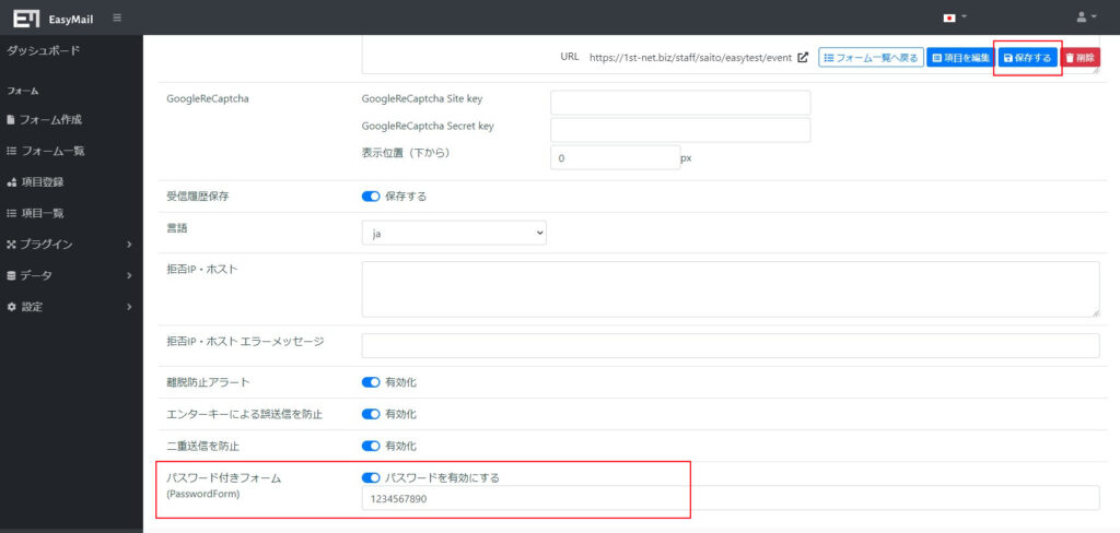 「パスワードを有効にする」をオンにしていただき、テキストボックスに任意のパスワードを設定し、フォーム編集画面上部にある保存するボタンをクリックしてください。