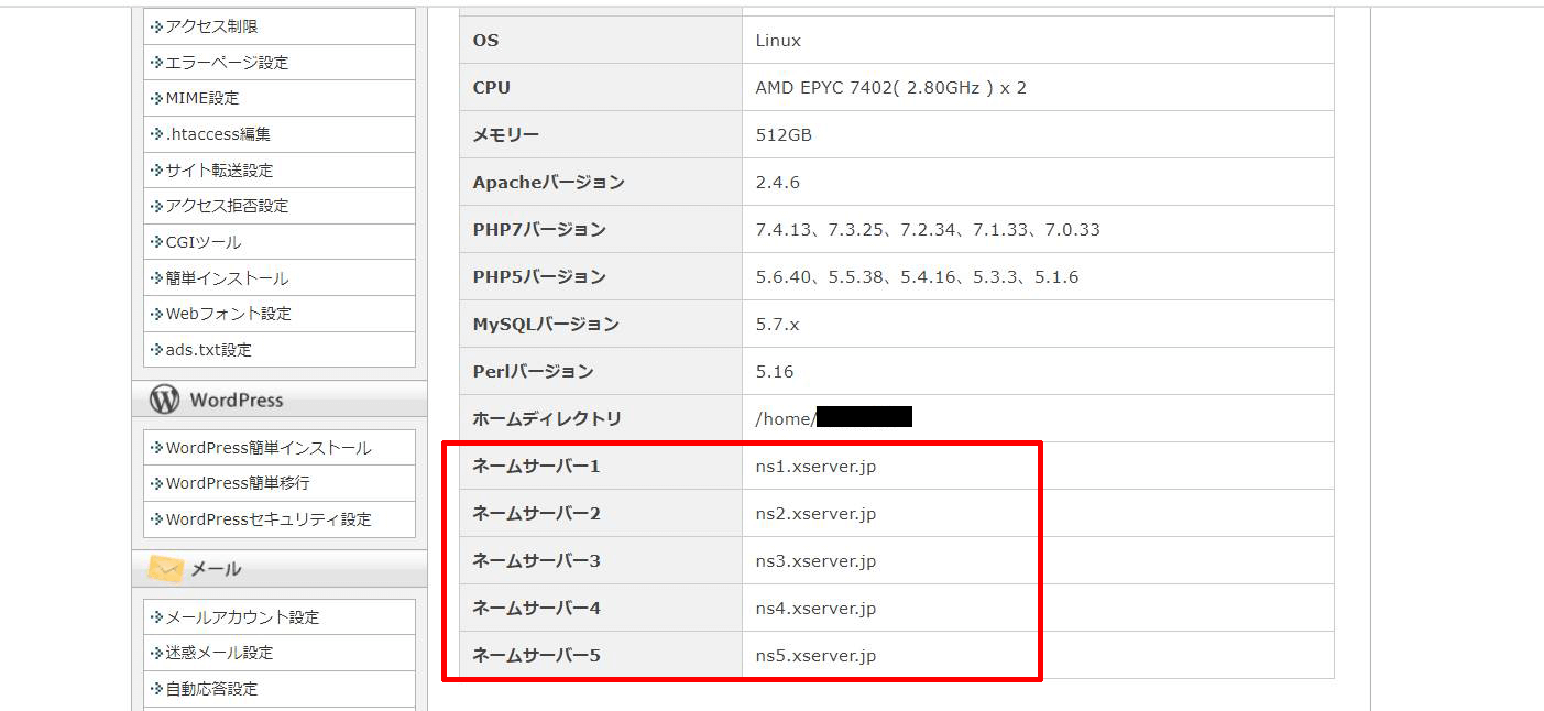 エックスサーバーのサーバーパネルにて、【アカウント】→【サーバー情報】に進むと、ネームサーバー情報が書かれています。