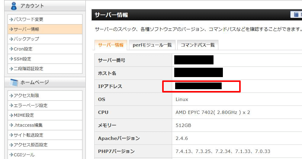 エックスサーバーではサーバーパネルの【アカウント】→【サーバー情報】に書かれています。